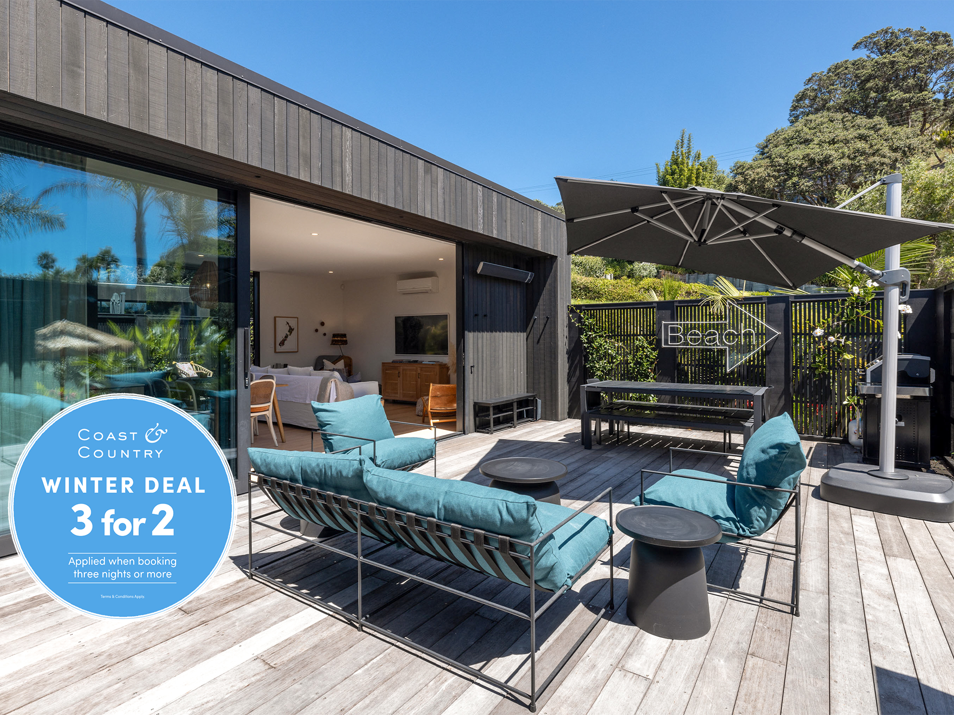 Contemporary New Zealand architecture gives Wavesong its great indoor-outdoor flow and captures the essence of a beachside holiday any time of the year.