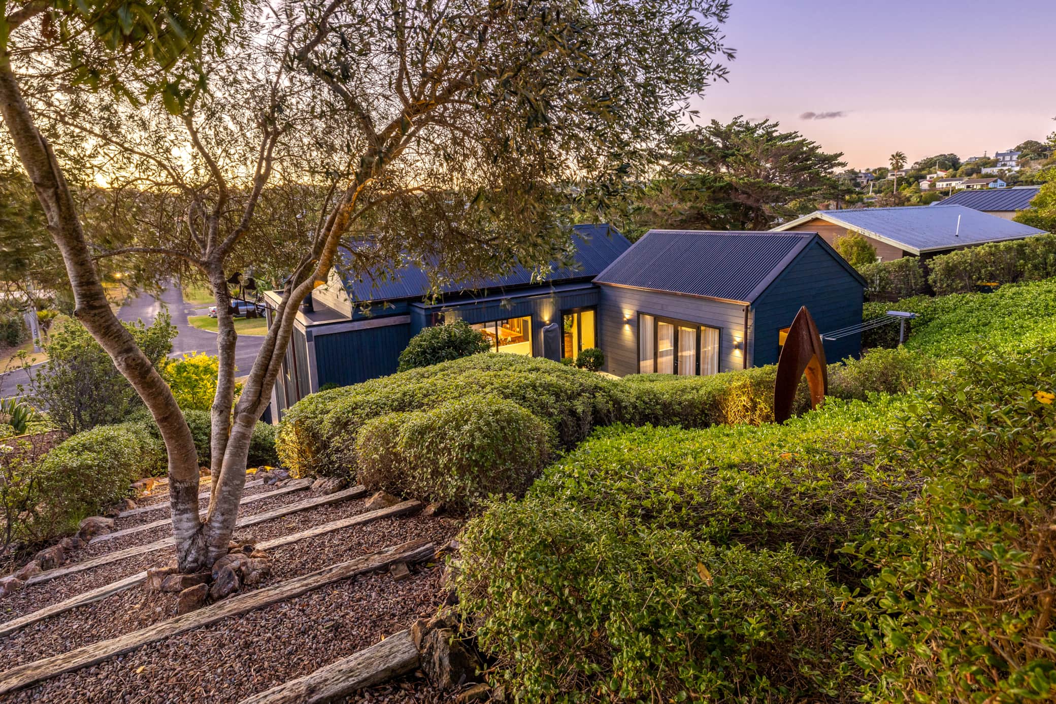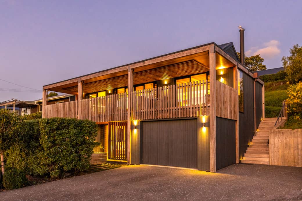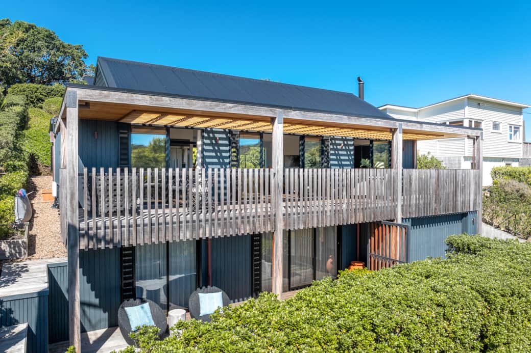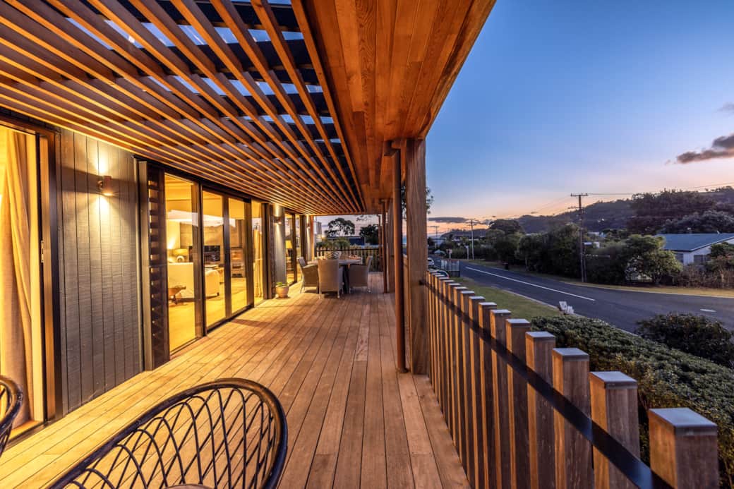 The deck is a standout feature of Moa Whare. Framed by architectural details and lush greenery, it provides a private space to relax, enjoy the fresh air, and take in the shifting light across the hills. Surrounding garden areas further enhance the sense of calm, connecting the home beautifully to its natural setting.